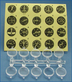 20 Instrumente von Altimeter bis Zylindertemperatur, die hinter die beiliegenden Kunststoffgläser ø 14 mm eingesetzt werden.