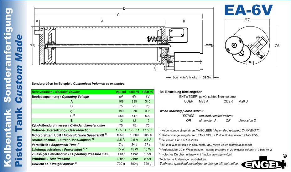 Kolbentank Typ EA mit Motor 540 und automatischer Endlagenabschaltung.
