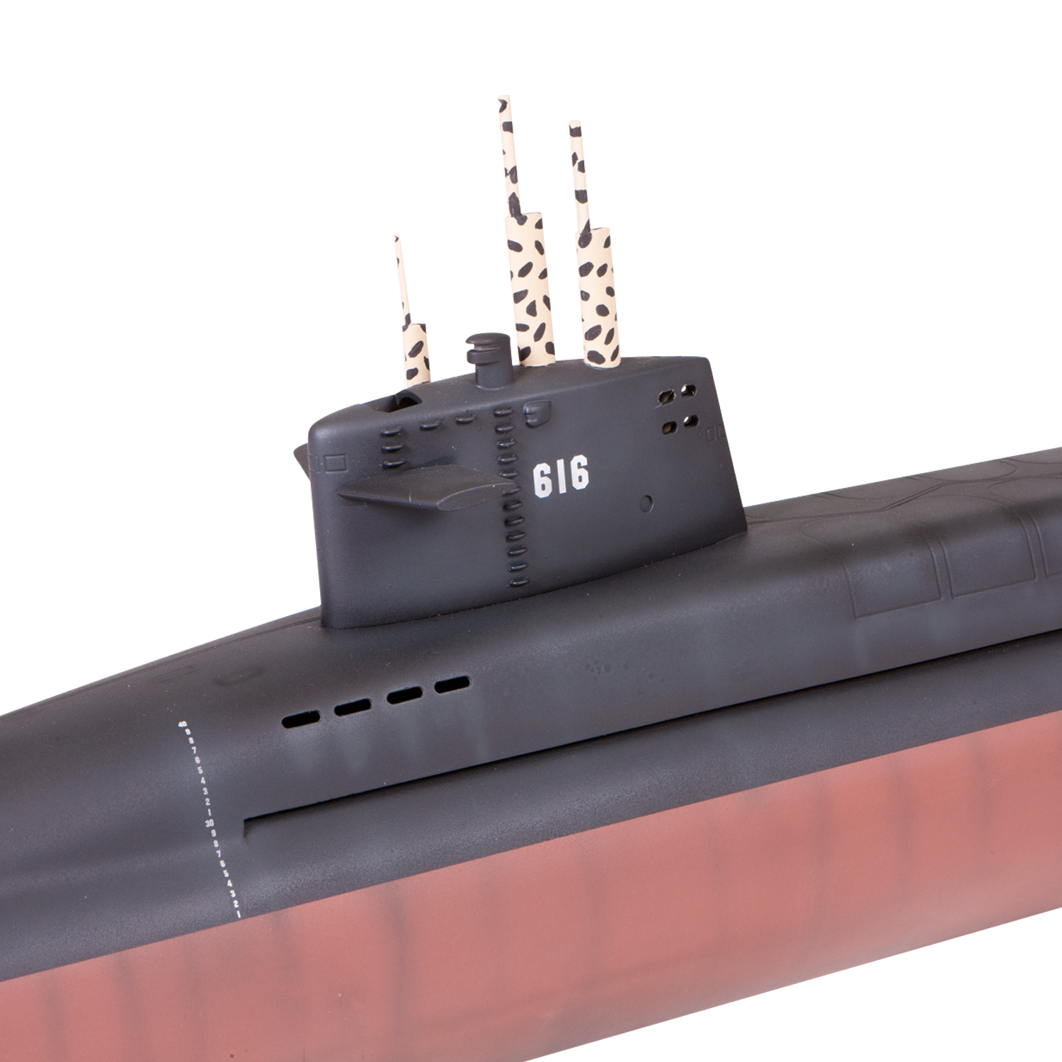 Darüberhinaus sind in die Rumpfoberfläche vorbildgetreue Details, wie Raketenschächte und Mündungsklappen, eingraviert.