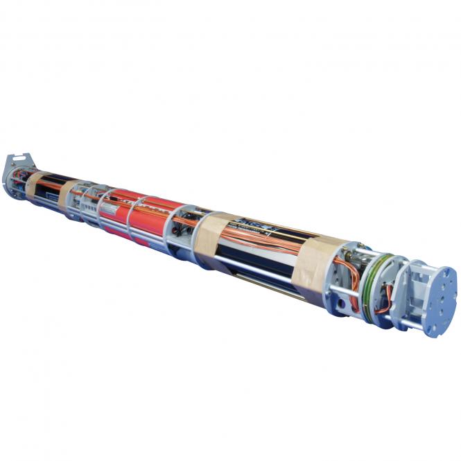 Die Bugsektion nimmt das Servo des vorderen Tiefenruders auf. Der Servo verbleibt beim Herausziehen des Technikgerüst im Druckkörper. Die physische Trennung des Servokabels erfolgt über eine von uns entwickelte Energie-Kupplung, die mit insgesamt 15 Kontaktstellen Anschlussmöglichkeiten für weitere Optionen (z.B. Positionslampen) bietet.