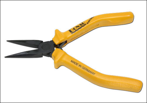 Hochwertige Elektronikzangen aus Carbon Stahl C45 + C60 (Schneidewerkzeuge) mit Doppelblattfeder. Fein polierte und phosphatierte Oberfläche. Griffe mit Abgleitschutz aus einer gelben 1-Komponenten-Hülle aus PVC.
